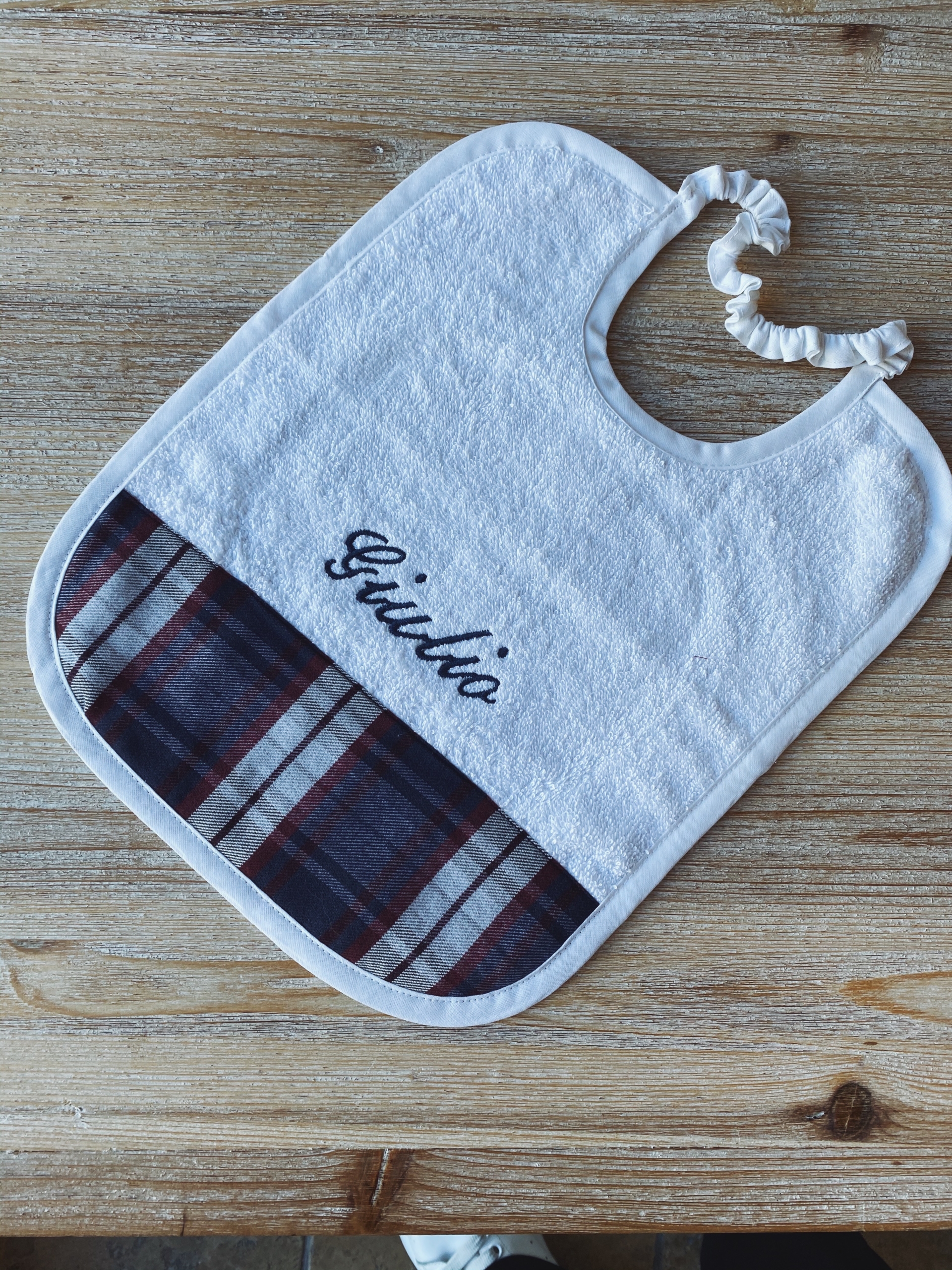 Bavaglio con elastico in spugna bianca 100%cotone, con balza in tartan bordeaux.