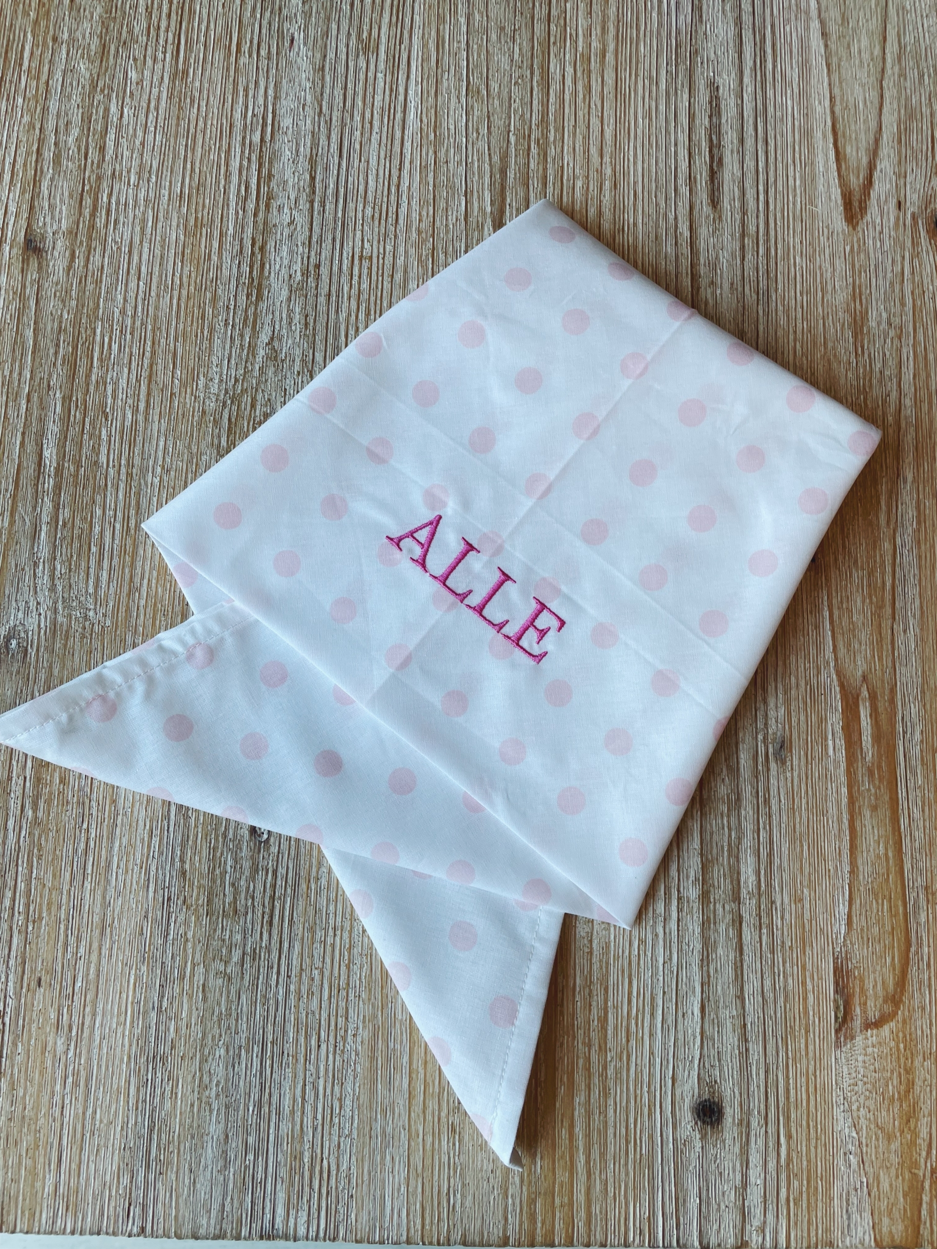 Bandana in cotone fantasia ricamata centralmente, misura 55×55 cm.