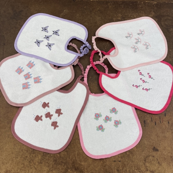 Bavaglio misura 31×25 cm, con elastico e disegni, abbinati a tono al colore del bordatore.