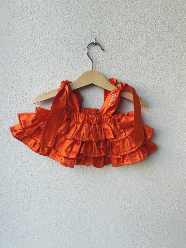 Camicia con gale a balze, taglia 80 cm, in raso arancio . Ricamo EL stampatello colore bianco.