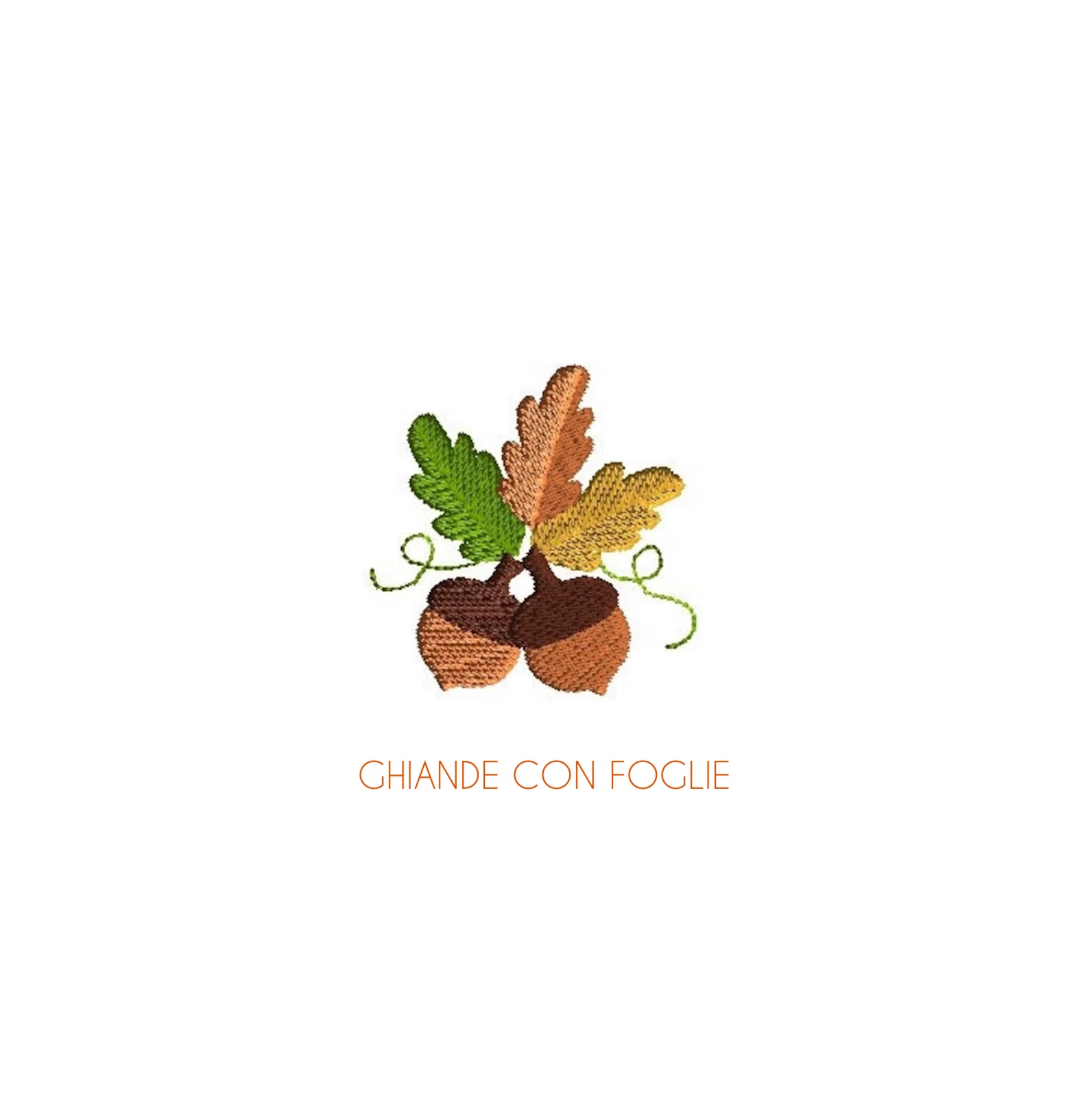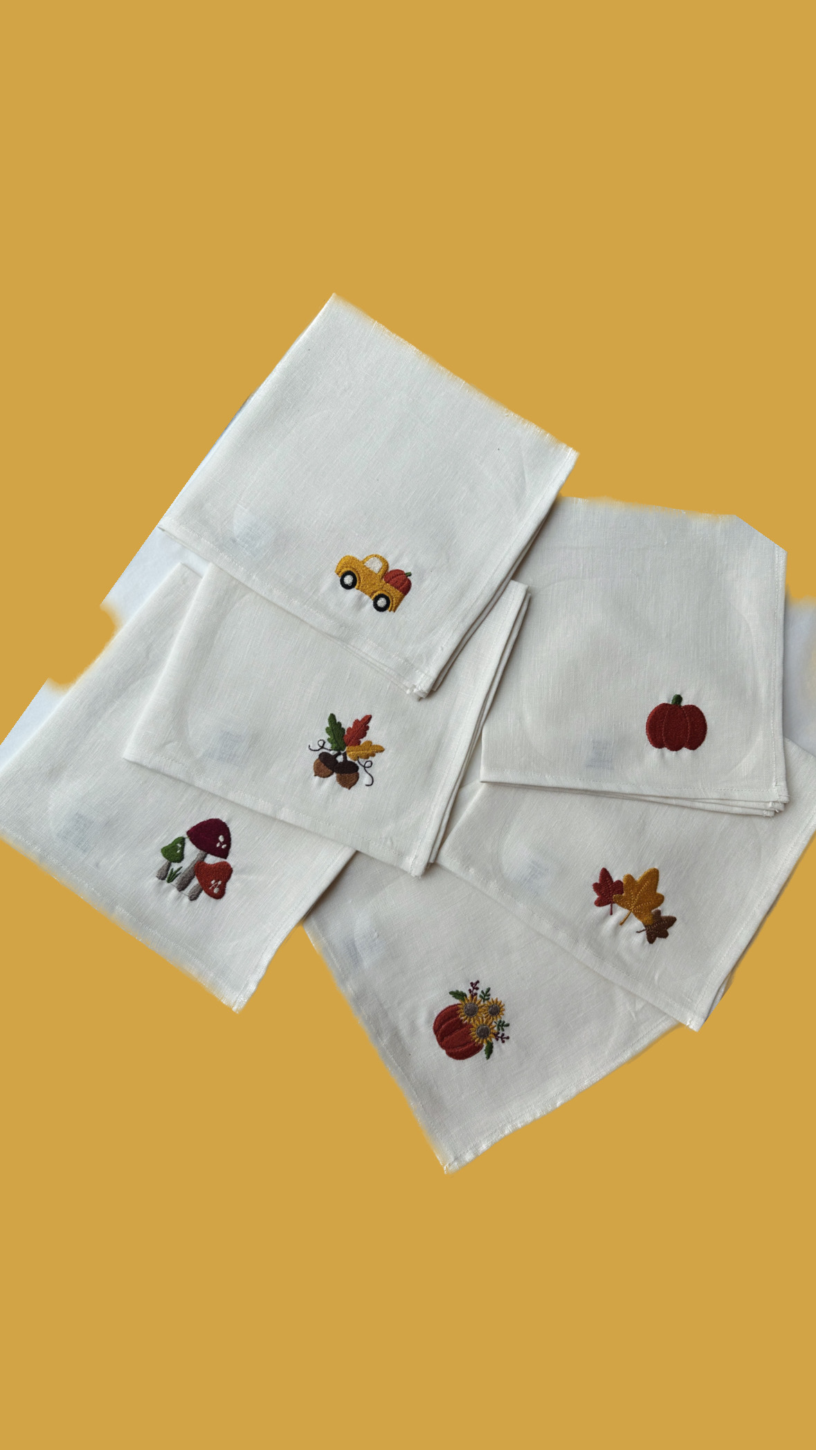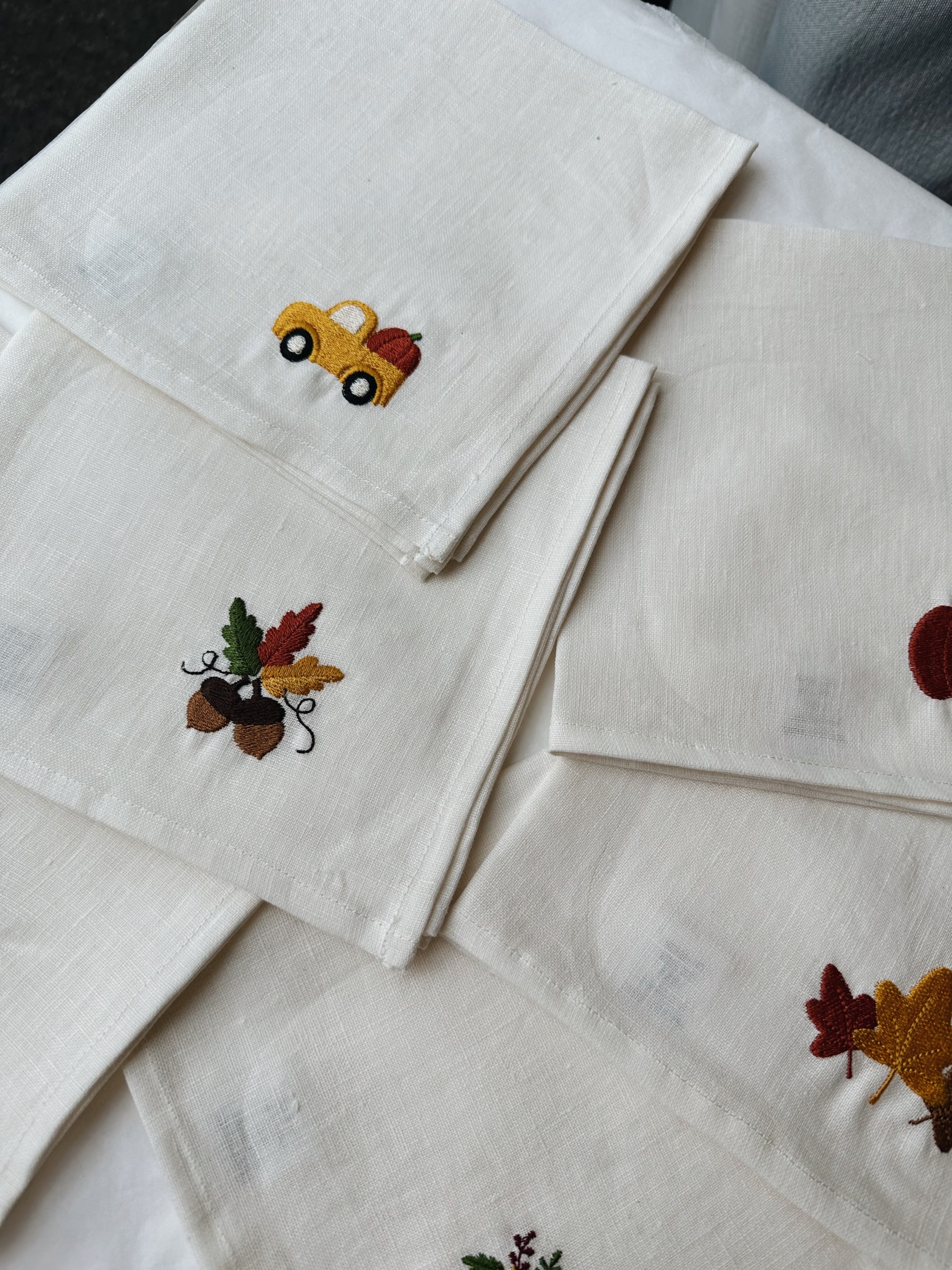 Pack di 4 tovaglioli in lino chiaro ricamati con disegni autunnali in palette colori autunnali.