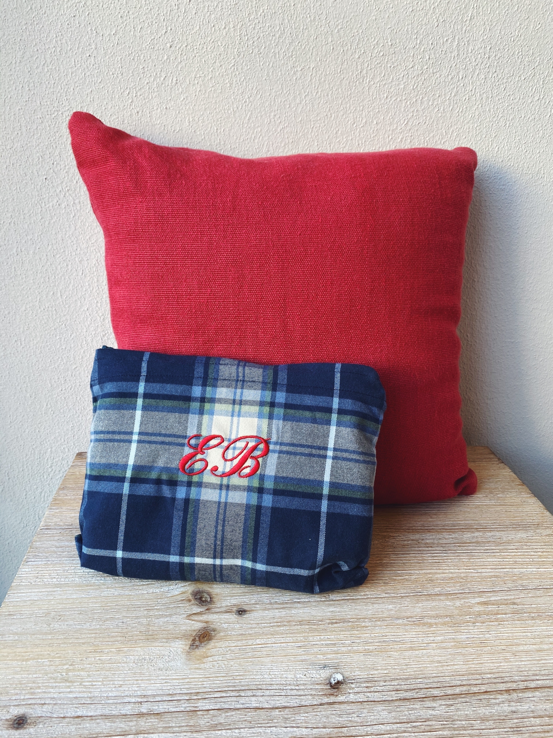 Pochette tartan verde ricamata “EB” in corsivo rosso.