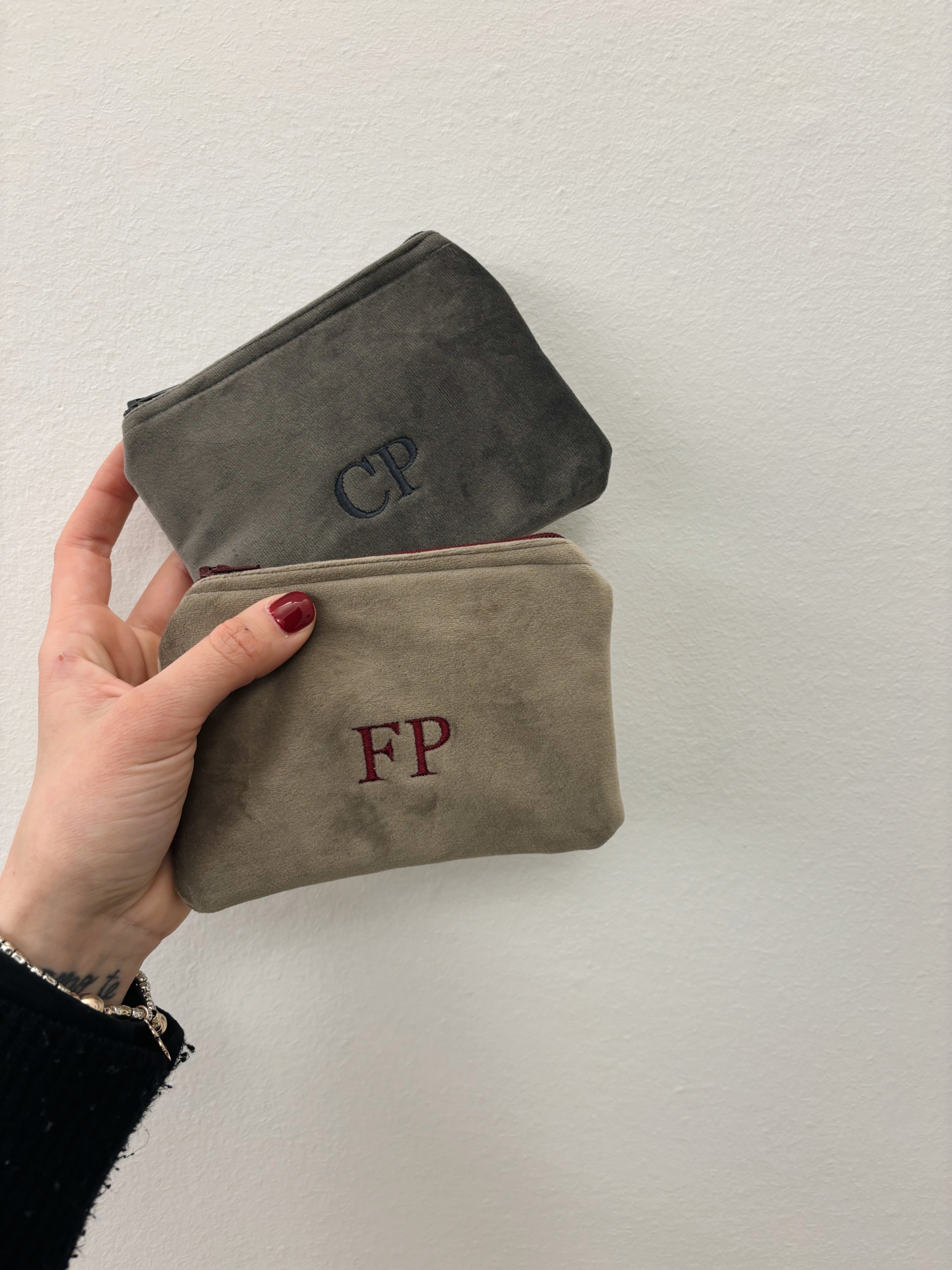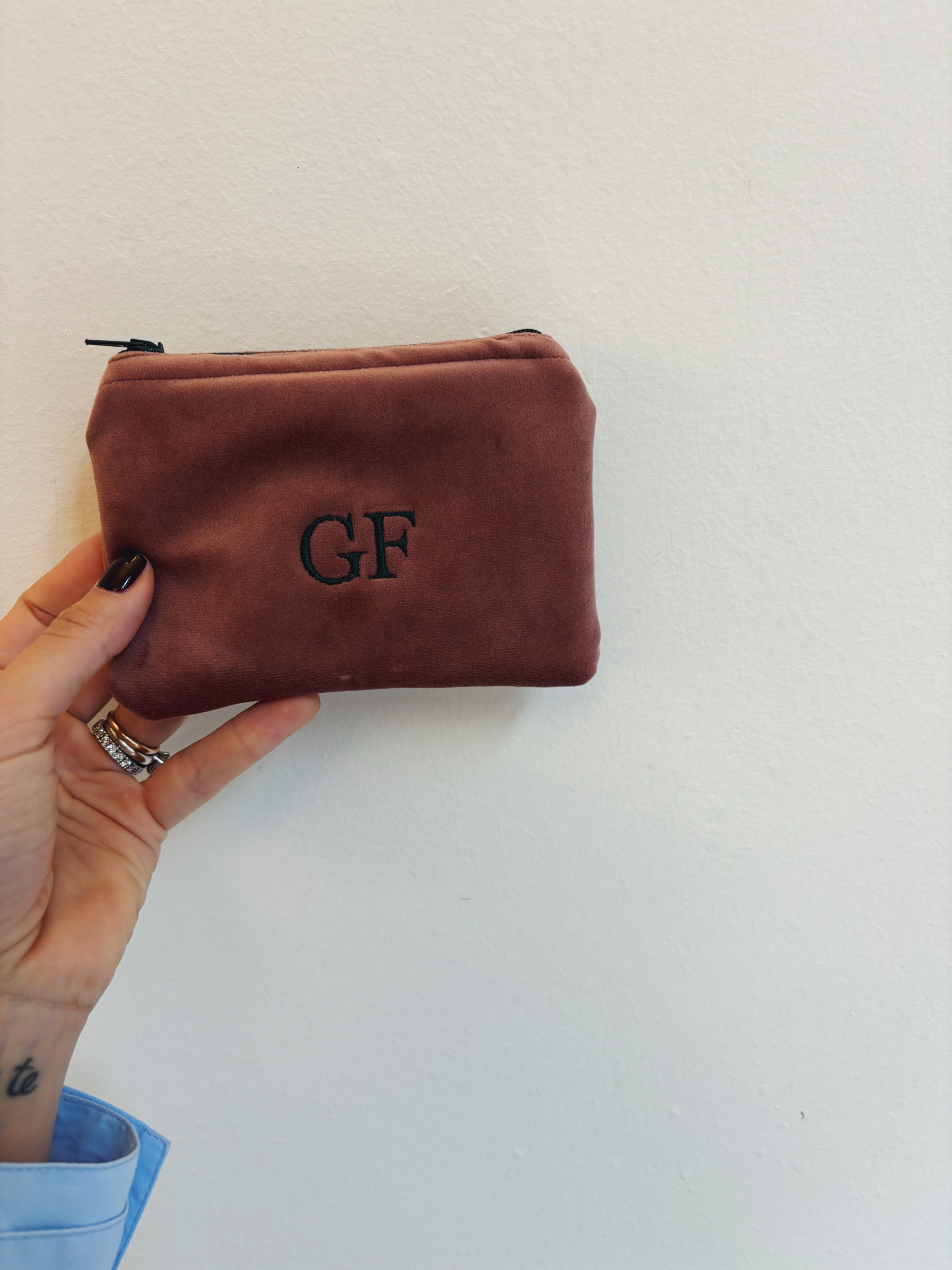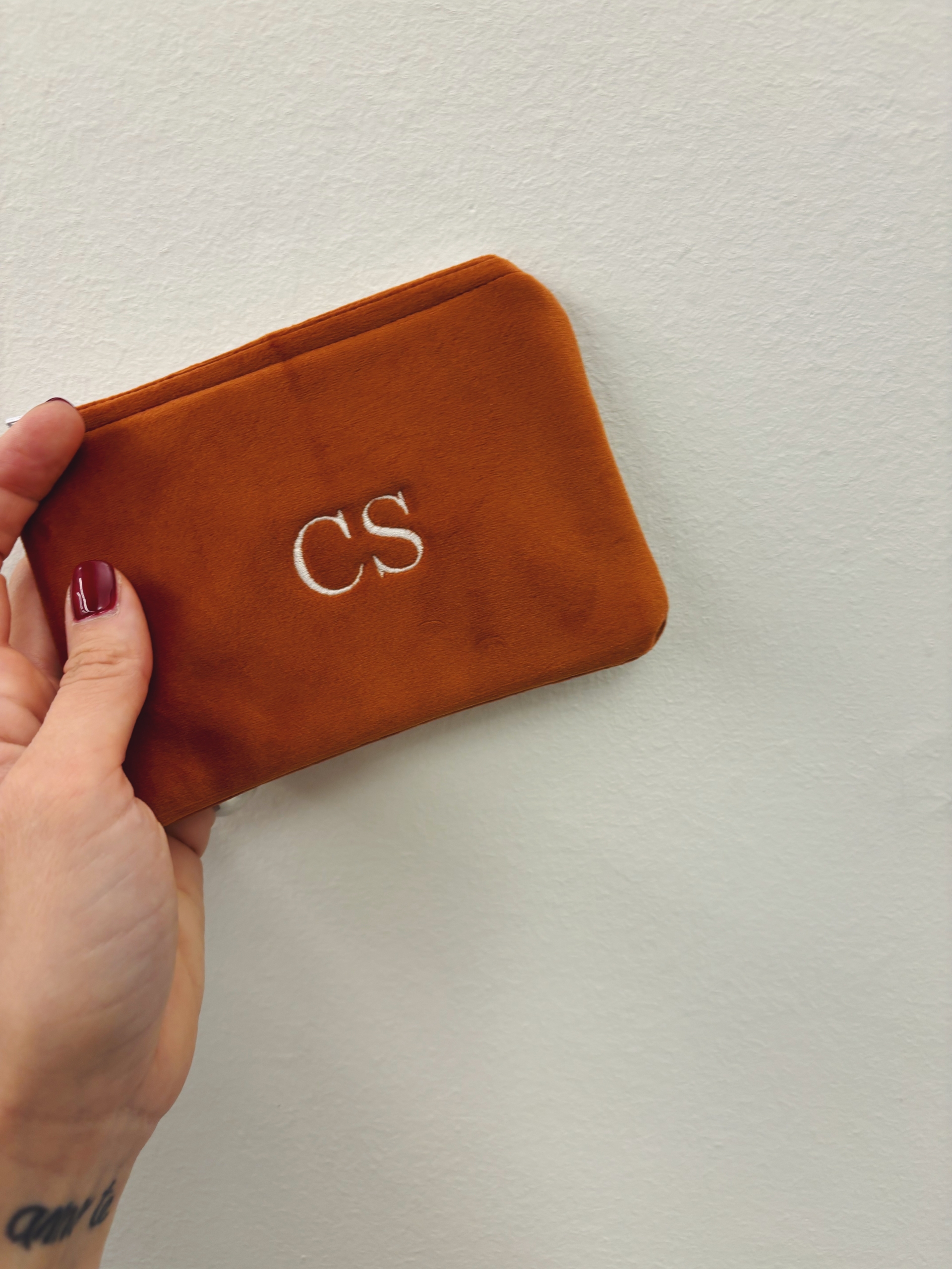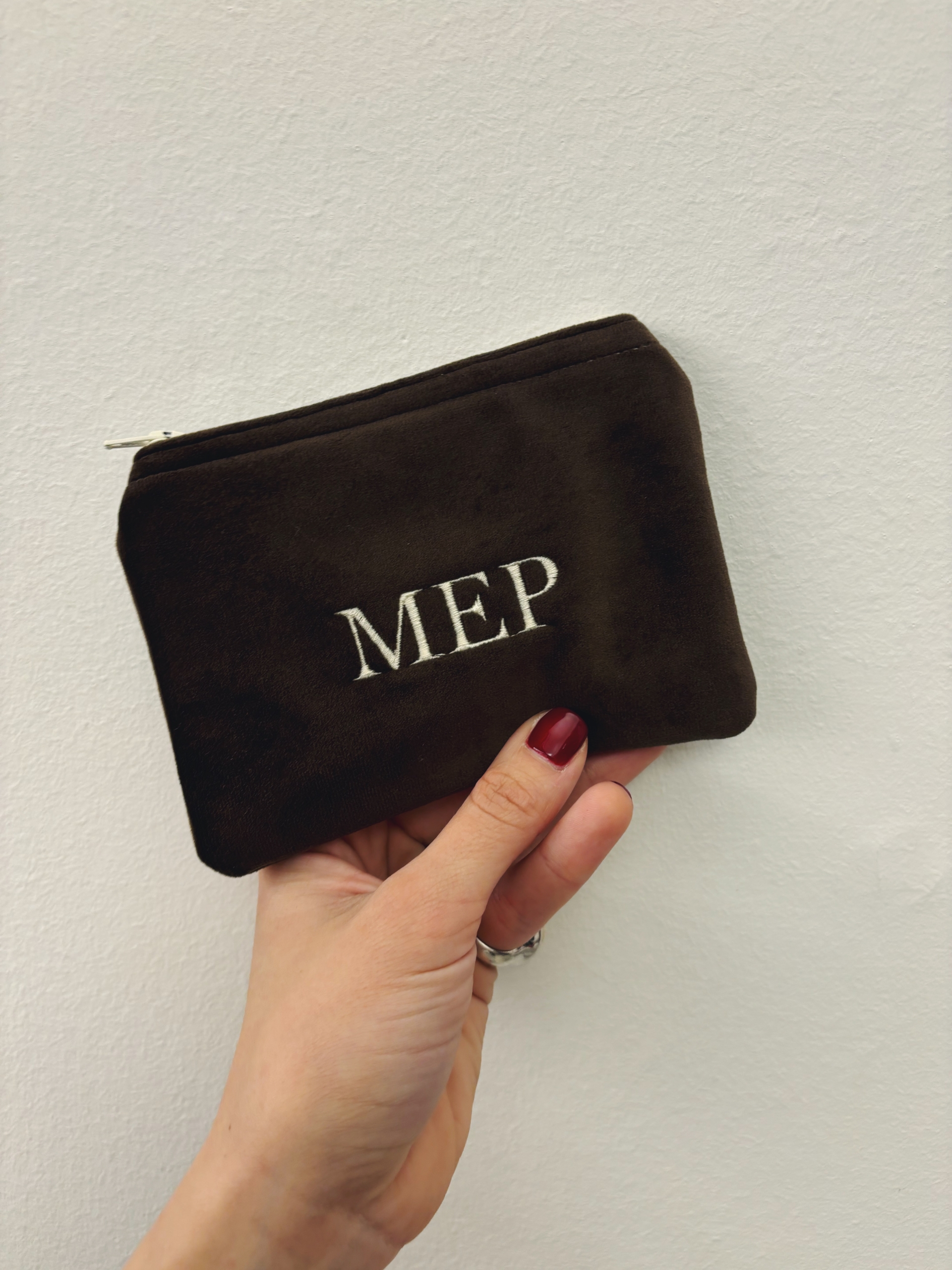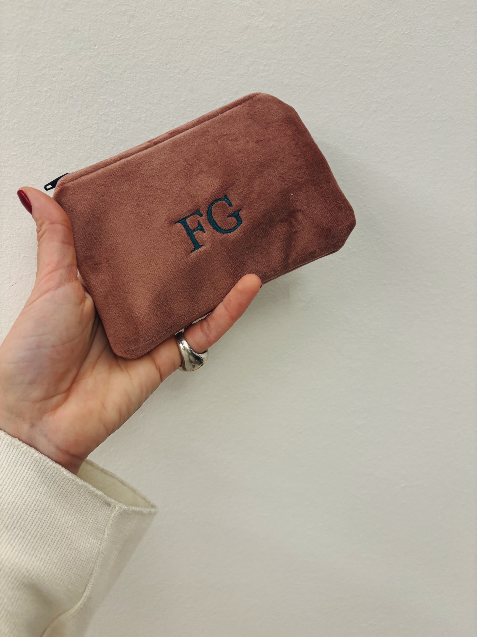 Portafoglio pochette in velluto, foderato internamente e imbottito.