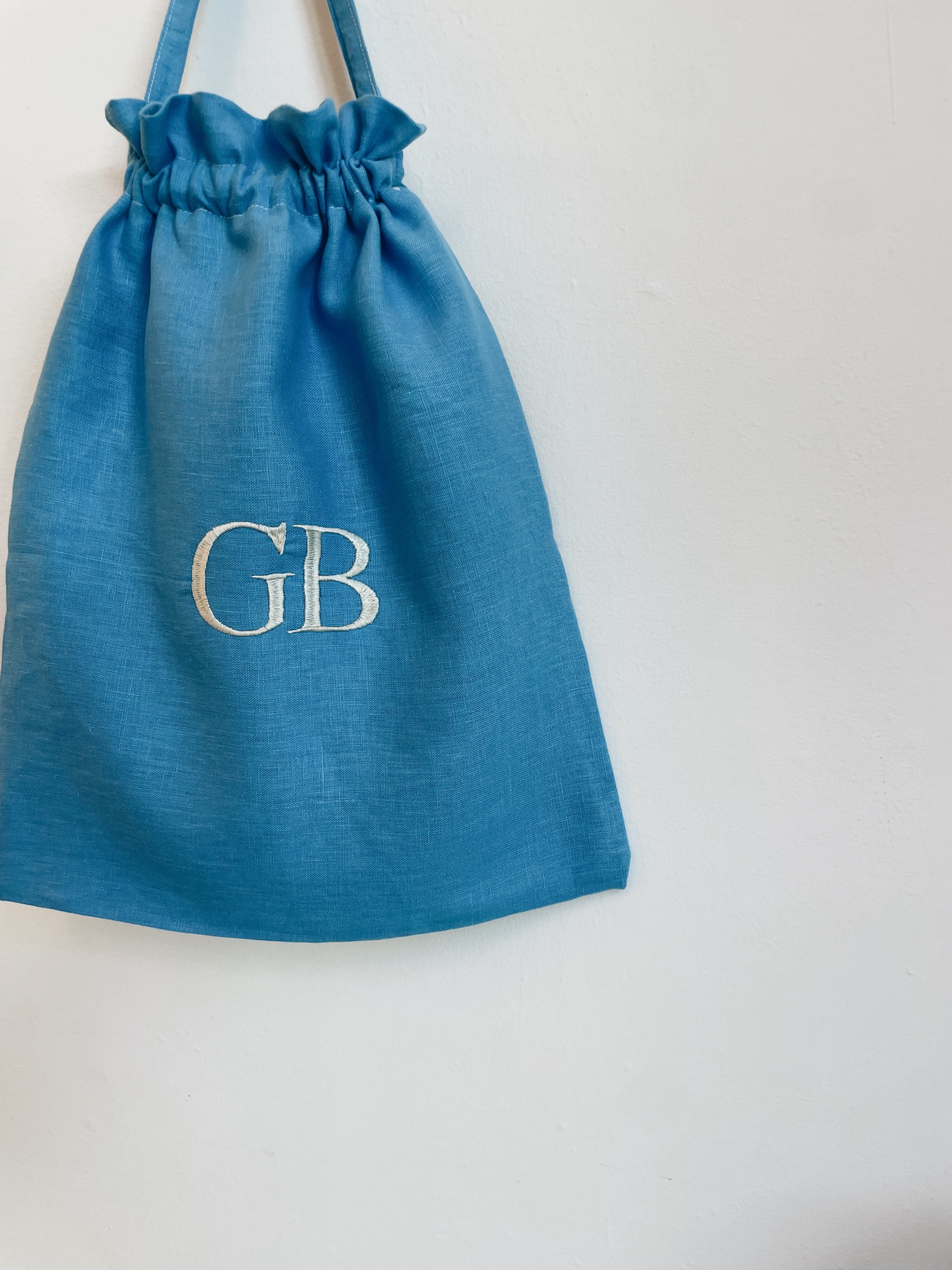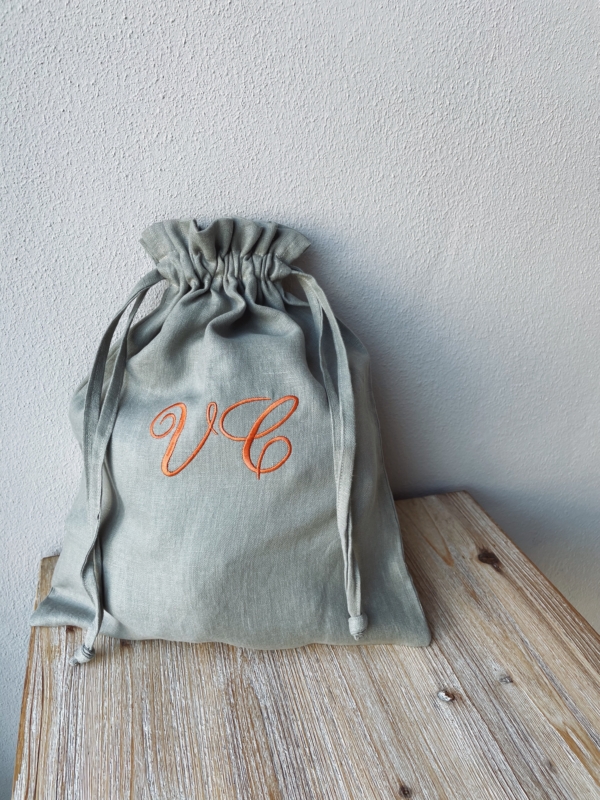 Sacca in lino, ricamata in corsivo.