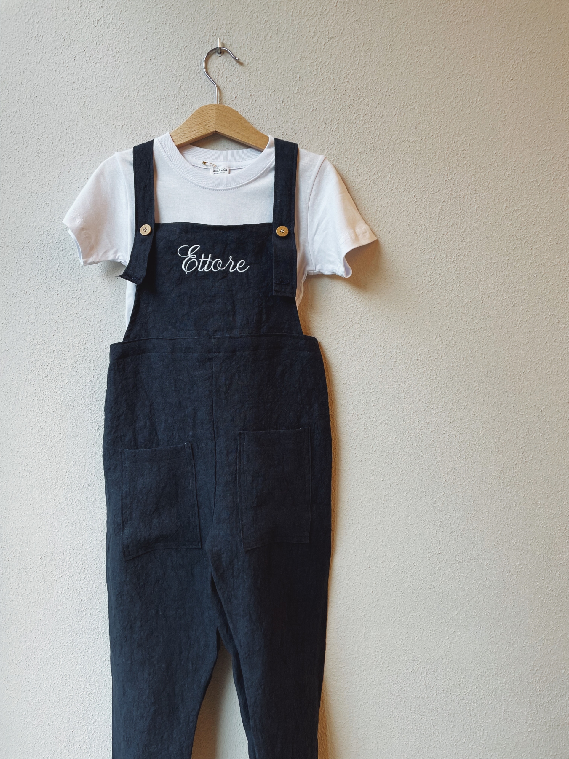 Salopette sartoriale in lino, pantalone lungo.