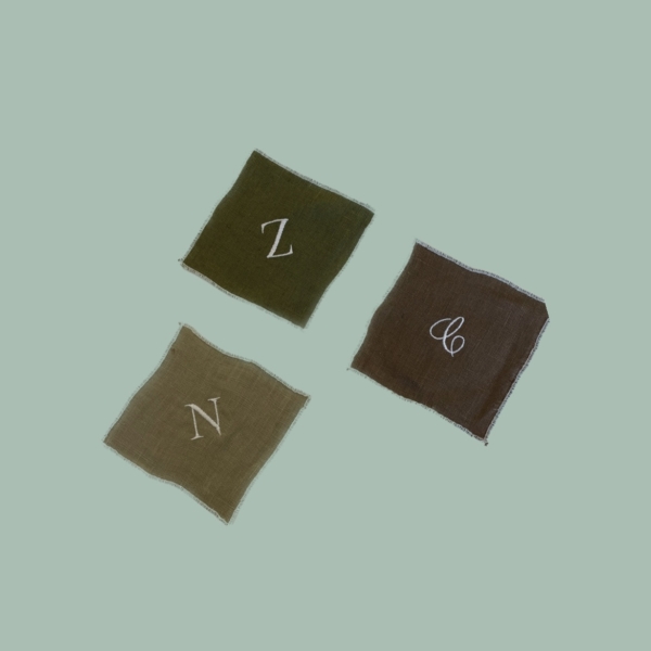 Sottobicchiere quadrato 10 cm in lino colori autunnali bordato a frullino in bianco.